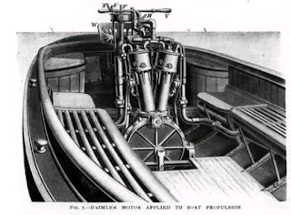 "1890s motorboat fitted with an early Daimler 1.5 horsepower narrow angle (17 degree) V-twin engine. These engines used a 'hot tube' ignition system, which was kept hot by a small Bunsen-type burner attached to the side of each cylinder head.